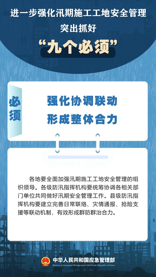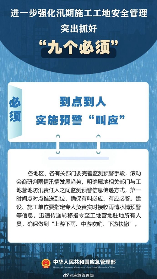 7月9日,國家防災減災救災委員會辦公室印發緊急通知,進一步強化汛期施工工地安全管理,要突出抓好“九個必須”↓↓ ???