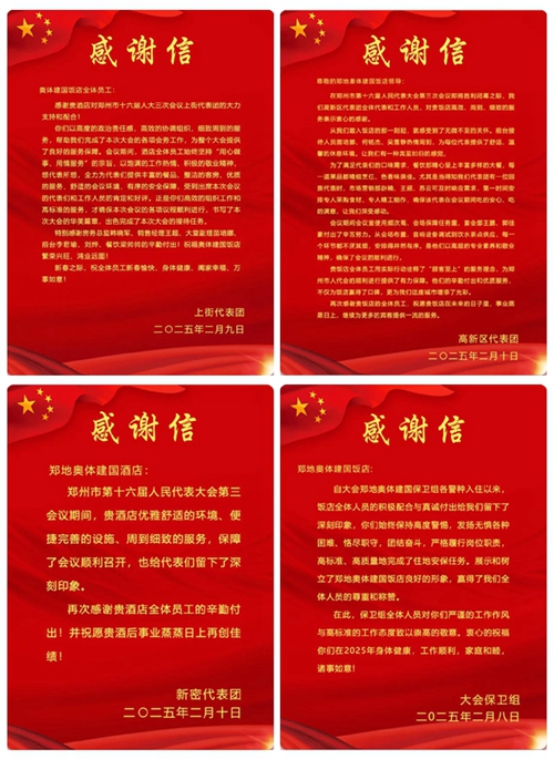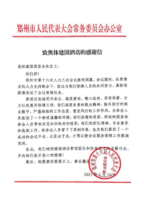 2025年2月10日,鄭州市第十六屆人民代表大會第三次會議第二次全體會議勝利閉幕。鄭州城市發展集團旗下河南鄭地奧體建國飯店作為本次大會的駐地保障酒店,以“五星”服務標準(環境舒心、食宿貼心、細節暖心、保障安心、文化潤心),圓滿完成了各項接待任務,贏得了與會代表和會務組的一致好評。