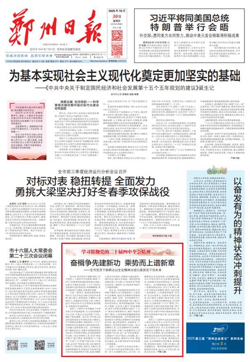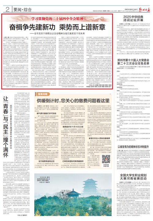 黨的二十屆四中全會擘畫了中國式現(xiàn)代化建設(shè)的宏偉藍(lán)圖,為新時代新征程國有企業(yè)改革發(fā)展指明前進(jìn)方向、提供根本遵循,鄭州城發(fā)集團(tuán)廣大黨員干部群眾深受鼓舞、倍感振奮。近日,《鄭州日報》《鄭州晚報》開設(shè)了【學(xué)習(xí)貫徹黨的二十屆四中全會精神】專欄,2025年10月30日,報道了鄭州城發(fā)集團(tuán)深入學(xué)習(xí)貫徹落實黨的二十屆四中全會精神,以全會精神為指引真抓實干創(chuàng)未來。